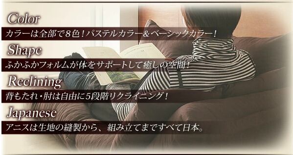 カラー選びが楽しくなる8色展開のふかふか素材リクライニングソファ。体をあずけたくなるフカフカ感&ボリューム感で快適なフロアライフを満喫。さらにゆったり出来るよう、背もたれ・肘に5段階リクライニング機能付きです。