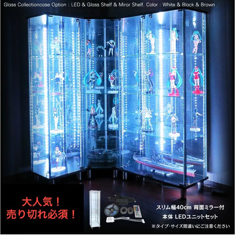 ガラスコレクションケース スリム 幅40cm ハイタイプ 背面ミラー 付き 本体 LEDセット 鍵付 ディスプレイラック