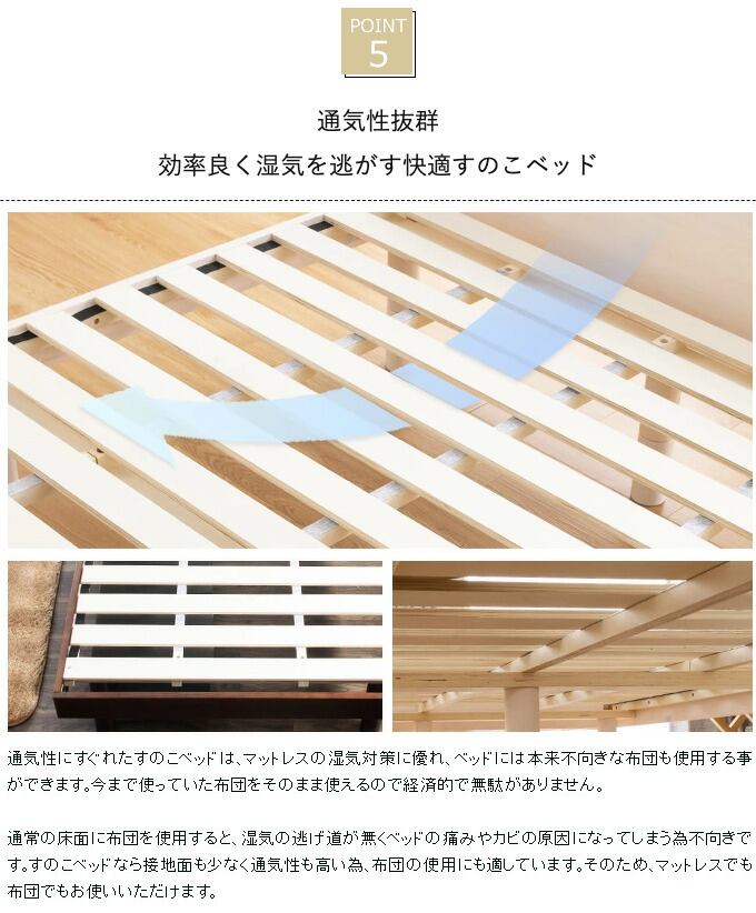 ○布団が使える厚み12mmのすのこ・高耐久構造で耐荷重200kg。